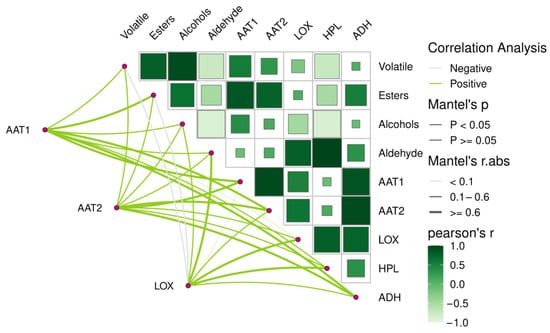 As shown in Figure 7 and Table 4, the total aroma substance content had a significant positive correlation with the expression level of AAT1. The ester content was significantly positively correlated with the expression levels of AAT1 and AAT2. No significant positive correlation existed between the alcohol content and the expression levels of AAT1, AAT2, LOX, and ADH. The aldehyde content was positively correlated with LOX and HPL, especially HPL.