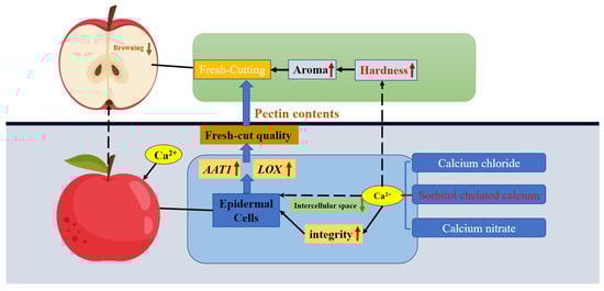 Sorbitol-chelated calcium treatment enhances the postharvest quality of fresh-cut apples by synergistically stabilizing cellular structure and modulating metabolic activity. It mitigates enzymatic browning and microbial proliferation through calcium-mediated reinforcement of cell walls, which reduce oxidative damage and nutrient leakage. Concurrently, the treatment elevates aroma-related volatiles and stress-responsive metabolites by upregulating key biosynthetic genes, while preserving ultrastructural integrity and delaying tissue softening (Figure 8). This integrated approach effectively extends shelf life, maintains sensory attributes, and suppresses spoilage, positioning it as a holistic preservation strategy for fresh-cut produce.