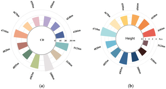 Plant height was calculated as the vertical difference between the mean elevation of the crown center (averaged from three repeated measurements) and the mean elevation of six surrounding bare-ground points. Crown diameter was determined by averaging three repeated measurements of the east-west and north-south diameters, followed by a secondary mean calculation (Figure 12a,b). Radial bar plots illustrating mean plant height, crown diameter, and elevation correlations were generated in Origin 2021.