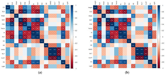 (a) Thermographic correlation matrix between crown diameter and environmental factors; (b) Thermographic correlation matrix between plant height and environmental factors. CD represents crown diameter (cm), CD denotes plant height (cm), ELE indicates elevation (m), and slope refers to slope gradient (°). Climatic variables include MAT, which represents mean annual temperature (°C); PRE represents precipitation (mm); AI represents aridity index aridity index; and PET represents potential evapotranspiration (mm). RH represents relative humidity (%), and light represents solar radiation (WH/m2) characterizing atmospheric conditions. Texcls soil texture denotes classification by the USDA system, SANDS indicates sand content (0 to 30 cm, %), CLAY indicates clay content (0 to 30 cm, %), SILT indicates silt content (0 to 30 cm, %), and pH indicates soil acidity (15 to 30 cm). GE categorizes geomorphic types using genetic classification. Same as below. (* p < 0.05, ** p < 0.01, *** p < 0.001).