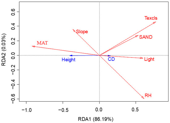 The overall model performance was statistically significant (p < 0.05), with the first axis of the RDA explaining a significant proportion of variance (p < 0.05), indicating robust structural constraints within the dataset. RDA triplot (Figure 3) revealed coordinated variations between plant height, crown diameter, and environmental drivers (red vectors: environmental factors; blue vectors: morphological traits). The first two axes collectively explained 86.22% of the variance (RDA 1: 86.19%, RDA 2: 0.03%). Multiple environmental factors synergistically shaped the morphological plasticity of K. compacta (Table 4), an endemic cushion plant in the Tibetan antelope Pantholops hodgsonii breeding grounds of the western Kunlun Mountains. This unique alpine environment has driven evolutionary adaptations in K. compacta’s architecture. Highly significant positive correlation (p < 0.001) with plant height shows dwarfing (reduced vertical growth) but expanded crown diameter under colder conditions. In summary, MAT exhibited additive interactions, jointly regulating the allometric balance between height and crown diameter investment.