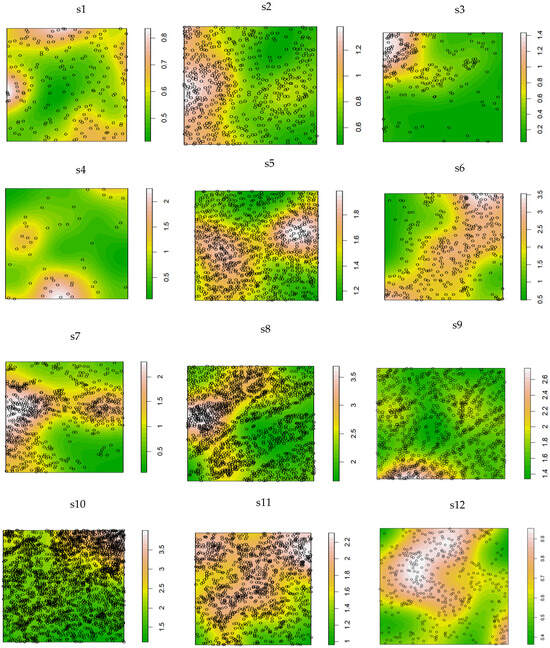 As illustrated in Figure 4, the spatial density of K. compacta exhibited distinct regional clustering. The highest densities (3.5 ind./m2) were observed in subplots s6, s8, and s10. In s6, individuals were concentrated in a northeast-southwest oriented belt-like distribution. s8 harbored dense aggregations in its western sector, while s 10 showed clustering in the northeastern region. Lower densities were recorded in s1 (0.8 ind./m2) and s12 (0.9 ind./m2), which displayed contrasting spatial trends: s1 exhibited a radially decreasing density gradient from the periphery toward the center, whereas s12 showed a concentrically decreasing gradient from the center outward. The remaining sampling sites demonstrated heterogeneous distribution patterns. These findings suggest that elevational variations in K. compacta spatial density are likely influenced by localized environmental factors, resulting in site-specific distributional configurations across elevational gradients.