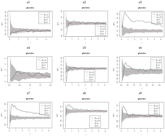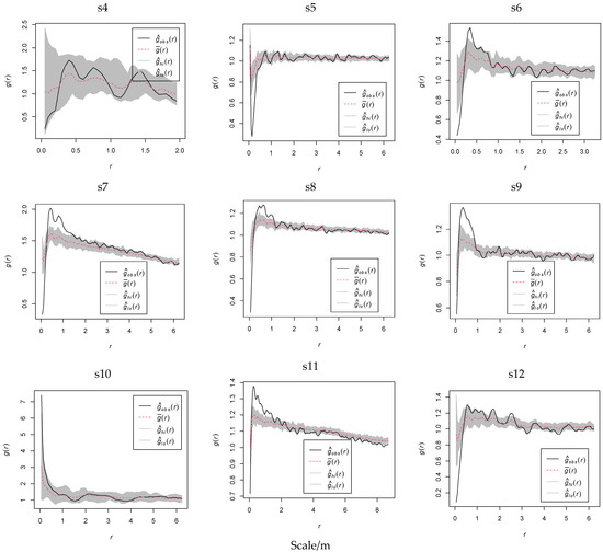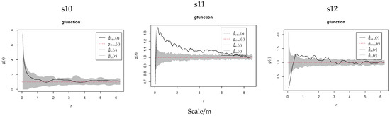 The univariate pair correlation function g(r), derived from Ripley’s K-function, addresses the inherent limitation of cumulative spatial pattern effects across scales in the K-function, where larger-scale patterns are confounded by the aggregation of smaller-scale interactions. To mitigate this bias, we applied the pair correlation function g(r) for analyzing the spatial point patterns of K. compacta along elevation gradients, as formally expressed in Equation (2). This approach isolates spatial associations at specific distances, enabling a scale-specific interpretation of clustering or dispersion independent of cumulative smaller-scale effects.