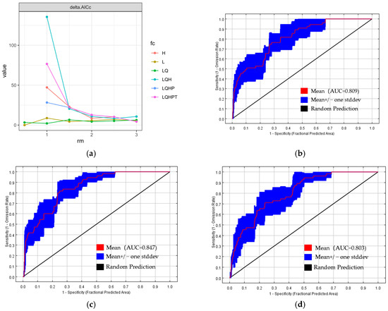 ΔAICc plot and time-period-specific ROC curves. (a) R-tuned ΔAICc plot; (b) ROC curve under current climate condition; (c) ROC curve under SSP126-2061 to 2080s; (d) ROC curve under SSP585-2061 to 2080s.
