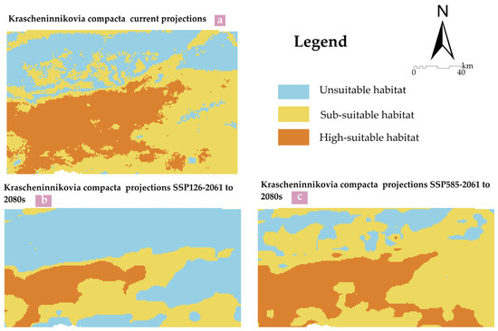 The distribution of suitable habitat areas for K. compacta under current and future climate conditions. (a) The distribution of suitable habitat areas for K. compacta under the current climate; (b) The distribution of suitable habitat areas for K. compacta under the SSP126 pathway from 2061 to 2080 in the future climate; (c) The distribution of suitable habitat areas for K. compacta under the SSP585 pathway from 2061 to 2080 in the future climate.