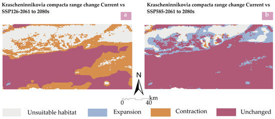 Distribution maps showing range change area of K. compacta under future climatic scenarios. (a) Comparison of suitable habitat areas for K.compacta between current (1970 to 2000s) and future (2061 to 2080s) under the SSP126 pathway; (b) Comparison of suitable habitat areas for K. compacta between current and future (2061 to 2080s) under the SSP585 pathway.