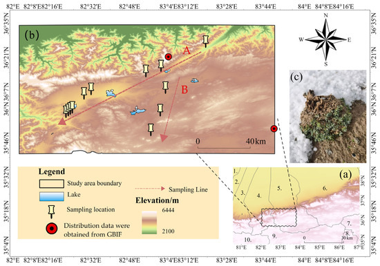 Geographical map of the research area. (a) The surrounding area of the research area; (b) The elevation of the research area; (c) Krascheninnikovia compacta. Note: 1. Moyu County; 2. Luopu County; 3. Qira County; 4. Yutian County; 5. Minfeng County; 6. Qiemo County; 7. Shuanghu County; 8. Nima County; 9. Gêrzê County; 10. Rutog County. A and B are the survey transect numbers.