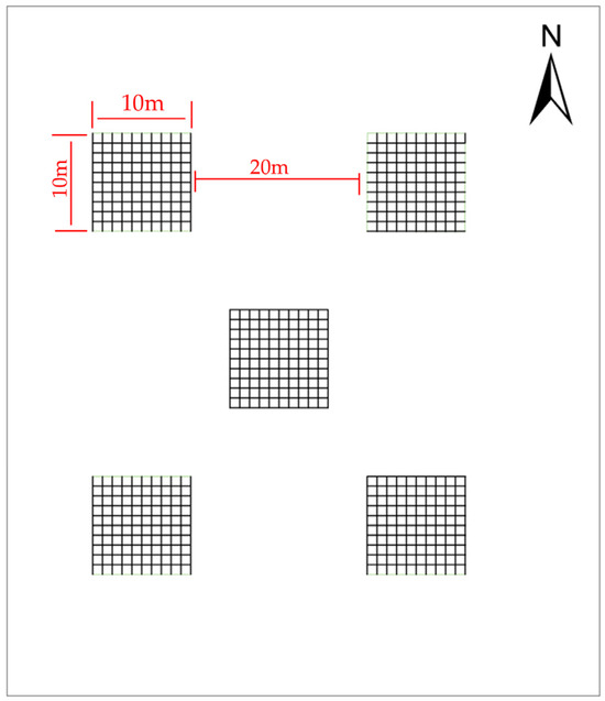 A DJI Phantom 4 Pro drone was deployed at a flight altitude of 150 m with a 5-second capture interval to acquire multispectral imagery. The images were processed in Agisoft Metashape (v2.1.2) to generate digital orthophoto maps (DOM) and digital surface models (DSM). Given the low stature of K. compacta, plant height and crown width measurements were conducted on the ArcGIS 10.8 platform by integrating DOM and DSM data. Each sample was divided into five large grids aligned with cardinal directions. Depending on sample size, each large grid was further subdivided into 1 m × 1 m subgrids: 45 subgrids in S6, 245 in S3, S5, and S11 and 500 in the remaining sample. Within each subgrid, individual K. compacta plants were measured (Figure 11). The sampling plots were configured with distinct grid specifications: Plot S6 featured 3 m×3 m grids with 5 m diagonal distance between adjacent grid vertices (measuring corner-to-corner distance), while plots S3, S5, and S11 contained 7 m × 7 m grids spaced at 10 m intervals. The remaining plots were established with 10 m × 10 m grids maintaining 20 m inter-transect spacing. The total sample sizes per plot were as follows: S1 and S2 (152 each), S3 (135), S4 (42), S5 and S6 (17 each), S7 (33), S8 (40), S9 (14), S10 (37), S11 (19), and S12 (49), yielding an initial dataset of 707 plants. Outlier detection in SPSS Statistics 25.0 removed 21 plants (4 from S1 and S2 each, 9 from S3, 1 from S9, 2 from S10, and 1 from S11), resulting in 686 valid plants.