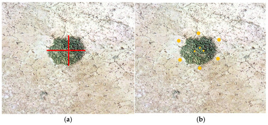 Morphological measurement measurements derived from DOM and DSM. (a) Crown diameter measurement; (b) Plant height measurement. Note: The red line segments in the left panel represent crown diameter measurements along the east-west and north-south directions, while the yellow points in the right panel denote elevation data extracted for bare ground and the centroid of the crown.