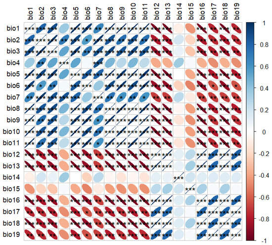 Correlation matrix of the 19 bioclimatic variables (* p < 0.05, ** p < 0.01, *** p < 0.001).