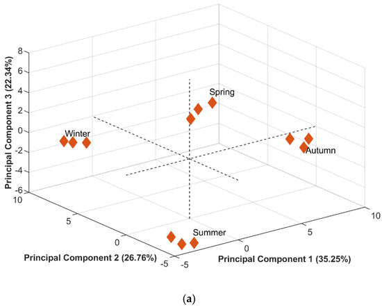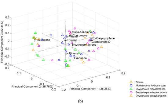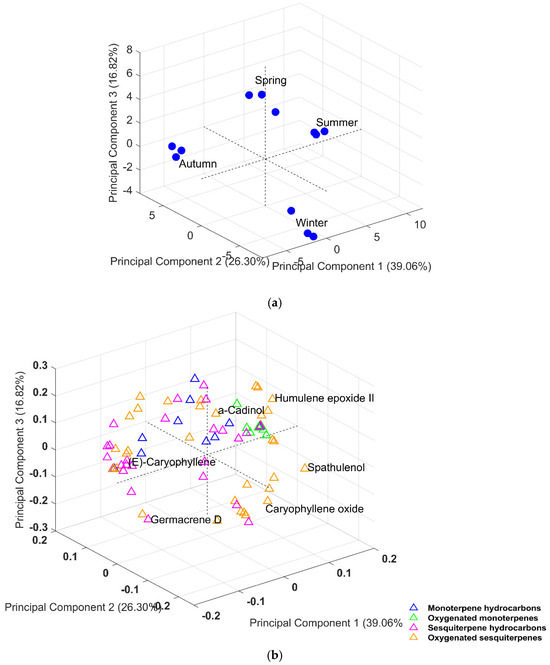 Scores of the three PCs differentiated the samples from each season (Figure 2a). Sesquiterpene hydrocarbon amounts were higher in the autumn EO (41.71%), which differentiated this sample from the others. Loadings (Figure 2b) have shown (E)-caryophyllene (9.05%) and germacrene D (11.74%) as major compounds only found in this season. Other major compounds were bicyclogermacrene (8.30%) and monoterpene hydrocarbon α-pinene (5.18%). In addition, oxygenated sesquiterpenes viridiflorol (1.84%) and rosifoliol (1.06%) were only found in this sample.