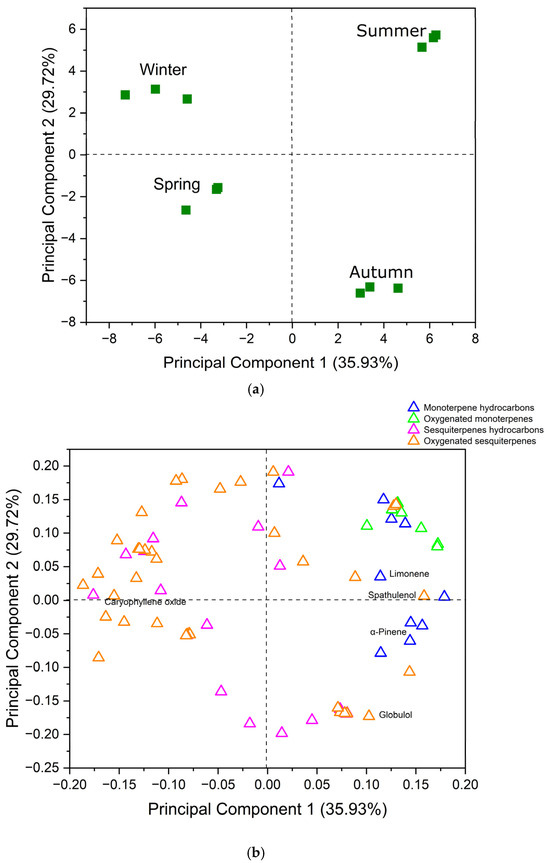 Scores of the two PCs differentiated the samples from each season (Figure 3). PC1 differentiated the winter and spring from the summer and autumn EO. This could be explained by the higher amounts of oxygenated sesquiterpenes in the winter and spring samples (53.94% and 50.84%, respectively), with caryophyllene oxide as a major compound present only in these EO (5.00% and 6.63%, respectively). On the other hand, the summer and autumn samples showed monoterpene hydrocarbon α-pinene as a major compound (6.08% and 5.81%, respectively).