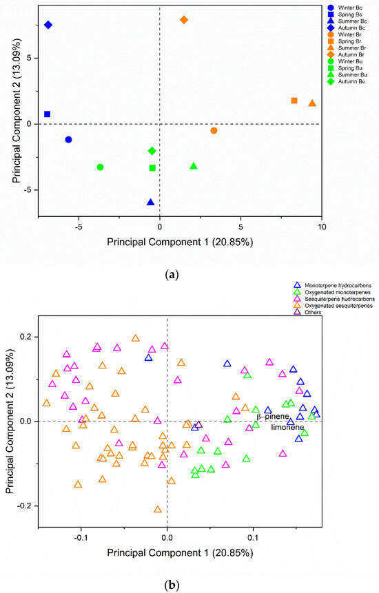 Scores of PC1 and PC2 could differentiate the samples based on compound classes (Figure 4). Winter, spring and summer samples from B. calvescens and winter, autumn and spring samples from B. uncinella were grouped based on their high contents of oxygenated sesquiterpenes (45.25 to 53.94%).