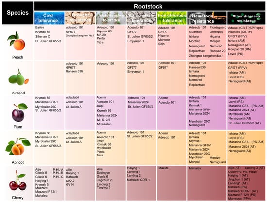 Ling, J.; Yu, W.; Yang, L.; Zhang, J.; Jiang, F.; Zhang, M.; Wang, Y.; Sun, H. Rootstock Breeding of Stone Fruits Under Modern Cultivation Regime: Current Status and Perspectives. Plants 2025, 14, 1320. https://doi.org/10.3390/plants14091320