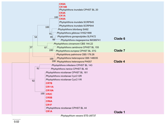 Multilocus phylogenetic tree based on internal transcribed spacer (ITS), β-tubulin (β-tub) and cytochrome c oxidase subunit 1 (COI) sequences, developed using the maximum likelihood method, in accordance with the Tamura–Nei model. The tree with the greatest log likelihood (−4792.34) is shown. Relationships between the 13 Phytophthora isolates characterized in this study (highlighted in red), the Phytophthora nicotianae and P. inundata isolates and other isolates of Phytophthora species from Clades 1, 4, 6 and 7 were used as references. Phytopythium vexans (isolate STE-U6737) was used as the outgroup.