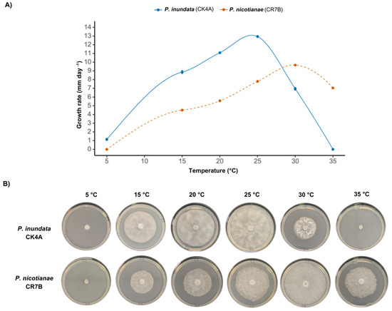 At extreme temperatures, differential species responses were observed. At 5 °C, P. inundata was able to grow, reaching a radial extension of 1.13 ± 0.13 mm/day after six days, whereas P. nicotianae showed no detectable growth. Conversely, at 35 °C, P. inundata showed no detectable growth, while P. nicotianae was able to grow, reaching a radial extension of 7.04 ± 0.06 mm/day.