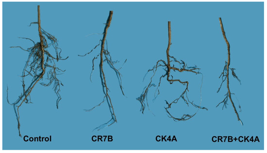 Symptoms of root rot on citrus saplings, 40 days after transplant in soil infested with P. nicotianae (CR7B), Phytophthora inundata (CK4A) and both Phytophthora species (CK4A+CR7B). No symptoms of root rot were observed in control plants.