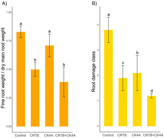 (A) The mean fine root/main root weight ratio of saplings of ‘Tarocco Lempso‘ sweet orange on Carrizo’ citrange rootstock, 40 months after transplanting into infested soil, with non-infested soil as control, soil infested with P. nicotianae (CR7B), soil infested with P. inundata (CK4A) and soil infested with both Phytophthora species (CR7B+CK4A). Bars represent standard deviations. Values sharing a common letter are not statistically different according to Tukey’s honestly significant difference (HSD) test (p ≤ 0.05). (B) The mean root damage class of ‘Tarocco Lempso’ saplings 40 months after transplanting into infested soil, with non-infested soil as control, soil infested with P. nicotianae (CR7B), soil infested with P. inundata (CK4A) and soil infested with both Phytophthora species (CR7B+CK4A). Bars represent standard deviations. Values sharing a common letter are not statistically different according to Tukey’s honestly significant difference (HSD) test (p ≤ 0.05).