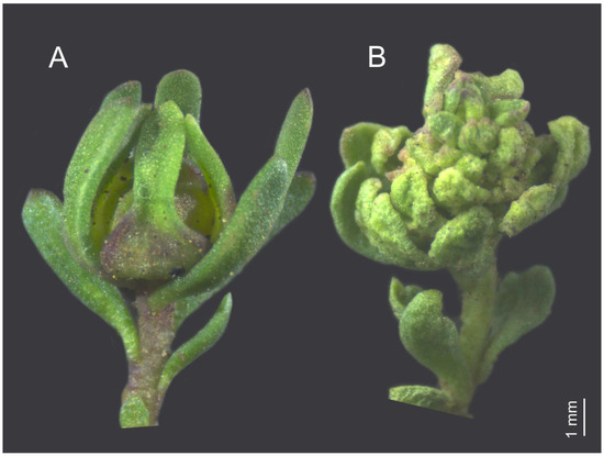 Galls are a type of herbivory in which an organism induces a tissue reorganization in a plant organ and gives place to a new structure that provides food, shelter, and/or protection to the gall inducer and its progeny [6]. Galls can take place in different organs of the plants, affecting their growth and reproduction [7]. They are usually located in leaves, stems, roots, and flowers [8,9,10]. A less common type of gall affects the whole inflorescence, as is the case reported here for the first time in a species of the mainly American genus Senega.