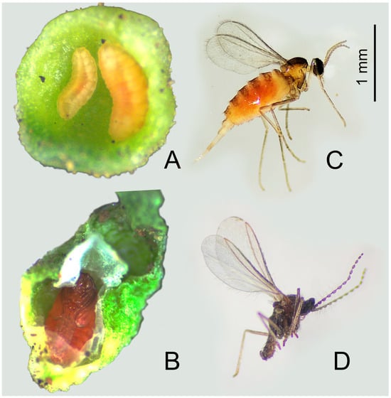 Cecidomyiidae (Diptera) life stages observed. (A) Two larvae on a hypertrophied leaf. (B) Pupae with part of the cocoon removed. (C) Adult female. (D) Adult male.