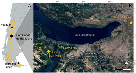 (A) Known distribution of Senega salasiana in Patagonia indicated by yellow dots (adapted from [17]). Black dots indicate gall occurrences in San Carlos de Bariloche, documented in this study, along with additional records from iNaturalist in Neuquén and Tierra del Fuego provinces [26,27]. (B) Populations of S. salasiana analyzed in this study around San Carlos de Bariloche. Yellow stars indicate the populations studied; yellow dots represent populations where no galls were found.