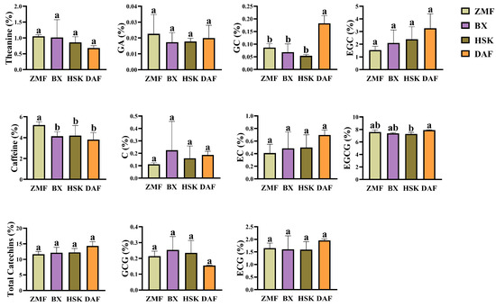 Content analysis of theanine, caffeine, and catechins in the leaves of four different Dancong ancient tea gardens (ZMF, BX, HSK, and DAF). Histogram and error bars represent mean ± standard deviation (SD) (%), and different letters (a, b) indicate the differences according to the Tukey HSD comparison method (p < 0.05), n = 3.