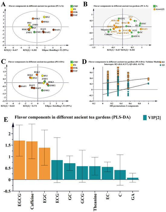 Multivariate statistical analysis of non-volatile compounds identified in fresh leaves of four different Dancong ancient tea gardens. (A) PCA plots of non-volatile compounds in fresh leaves of different Dancong ancient tea gardens; (B) double-label plots of non-volatile compounds in fresh leaves of different Dancong ancient tea gardens; (C) PLS-DA score plots of non-volatile compounds in fresh leaves of different Dancong ancient tea gardens. (D) Cross-validation results: the intercepts of the Q2 replica lines of the cross-validated model for the 200 comparisons were less than 0, which indicated that the PLS-DA discrimination model had not been overfitted and that the model is relatively reliable. (E) VIP score plot: orange color bar indicates non-volatile compounds with VIP > 1; green color indicates non-volatile compounds with VIP < 1.