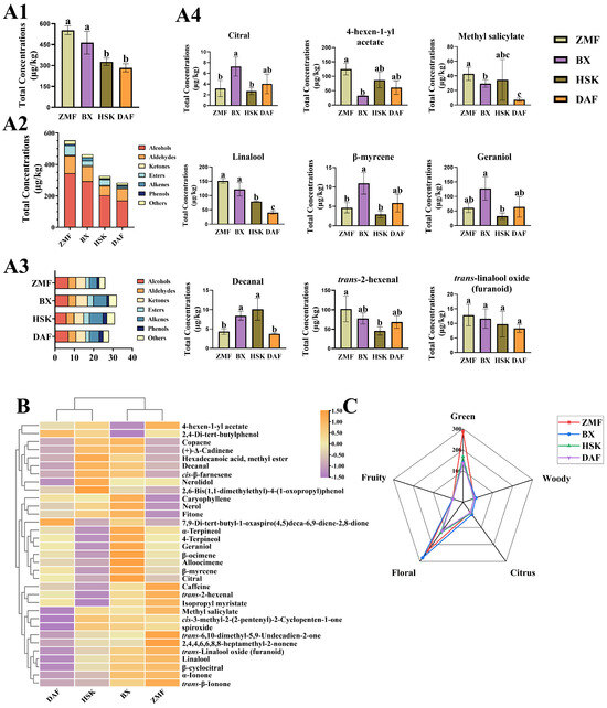 The differences in volatile compounds content in fresh leaves of four different Dancong ancient tea gardens were analyzed from different perspectives. (A1) represents the differences in the total concentration of volatile substances in fresh leaves of four different Dancong ancient tea gardens; (A2) represents the concentration of different categories of volatile substances identified; (A3) represents the number of different categories of volatile substances identified; (A4) represents the differences in the concentration of the nine volatile substances with the highest concentration identified; (B) represents a heat map of the concentration of identified volatiles; (C) represents the radar plot of total amount of aroma compounds of different types of fresh leaves from different Dancong ancient tea gardens. Histogram and error bars represent mean ± standard deviation (SD) (%), and different letters (a, b, c) indicate the differences according to the Tukey HSD comparison method (p < 0.05), n = 3.
