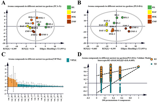 Multivariate statistical analysis of volatile compounds identified in fresh leaves of four different Dancong ancient tea gardens. (A) PCA plots of volatile compounds in fresh leaves of different Dancong ancient tea gardens; (B) PLS-DA score plots of volatile compounds in fresh leaves of different Dancong ancient tea gardens; (C) VIP scoring plots: orange color bars indicate volatile compounds with VIP > 1; green color indicates volatile compounds with VIP < 1. (D) Cross-validation results: 200 comparisons of the cross-validated model, the intercept of the Q2 replica line is less than 0, indicating that the PLS-DA discriminant model is not overfitted and the model is relatively reliable.