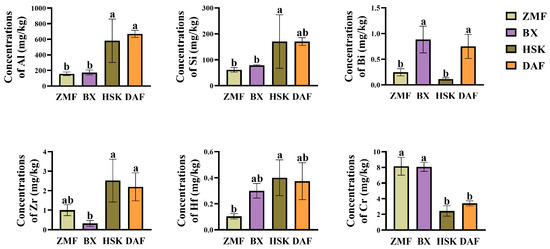 As the saying goes, “Good tea comes out of high mountain clouds and mist”. The low-altitude Dancong ancient tea garden ZMF selected in this study has a higher content of aroma than other high-altitude tea gardens, even though it is slightly inferior to other high-altitude tea gardens in terms of flavor compounds. In addition, in the three higher altitude tea gardens (BX, HSK, DAF), there were some significant differences in the aroma compounds of their fresh leaves. In order to further investigate the reasons for these phenomena and differences, we focused on the elemental contents of the fresh leaves of these four different Dancong ancient tea gardens. Tea fresh leaf samples were collected from the corresponding loci of the studied tea garden soils, which were digested and determined by full scanning with ICP-MS, and the elemental contents of the tea fresh leaves are shown in Table S1. There were differences in the contents of different elements in the four ancient tea gardens, and the average size of the elemental contents of the tea fresh leaves were in the following order: N > K > P > Mg > Ca > Al > Mn > Na > Fe > Si > Zn > Sr > Li > Ba > B > Cu > Cr > Ni > Ti > Zr > As > Bi > Co > Mo > Hf > V > Sn. Among all the detected elements, six elements (Al, Si, Bi, Zr, Hf, and Cr) significantly differed in the fresh leaves of four different Dancong ancient tea gardens (Figure 5). The elemental contents of Al, Si, Zr, and Hf showed similar trends of differences among the four tea gardens, with the Al content in fresh leaves of the lower altitude ZMF tea garden being 73.09% and 76.64% lower than that in fresh leaves of the HSK and DAF tea gardens, respectively, whereas there was no significant difference in the Al content of fresh leaves of the two tea gardens compared to that of the highest altitude BX tea garden, which was only 9.9% lower than that of BX (p < 0.05). For Cr content, the content of this element in fresh leaves of ZMF tea garden at a lower altitude was not significantly different from that in fresh leaves of the BX tea garden at the highest altitude, which was 0.99% higher than that of BX (p < 0.05); however, it was significantly higher than that of HSK and DAF tea gardens, which were 234.79% and 138.67% higher, respectively (p < 0.05). Therefore, it was presumed that the differences in elemental content of fresh leaves at different altitudes may be responsible for the differences in the content of volatile and non-volatile substances among different tea gardens. The differences in these compounds, in turn, affect the quality of the tea.