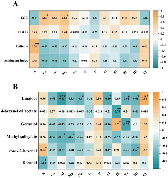 (A) Correlation heat map between the concentrations of 12 elements affecting the differences in fresh leaves of four different Dancong ancient tea gardens and the concentrations of key inclusions and quality indexes therein. (B) Correlation heat map between the concentrations of 12 elements affecting the differences in fresh leaves of four different Dancong ancient tea gardens and the concentrations of six potentially key aroma compounds. The darker/lighter color of the squares represents higher/lower correlation, orange indicates a positive correlation, green indicates a negative correlation, and the numbers in the squares indicate the Pearson correlation coefficients, and “*” indicates the significance of this correlation at p < 0.05, and “**” indicates the significance of the correlation at p < 0.01, and “***” indicates the significance of the correlation at p < 0.001.