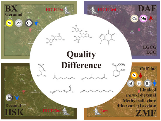In addition, it has been shown that altitude is negatively correlated with temperature and that cold stress induces the release of linalool and geraniol [44]. The linalool and geraniol contents of BX, HSK, and DAF in this study had a similar pattern to their study. However, the lower elevation ZMF had higher levels of both volatile compounds which, combined with the correlation analysis (Figure 6B), may be related to its higher N and P content and lower Al, which needs to be verified by investigating its soil background values (Figure 7).