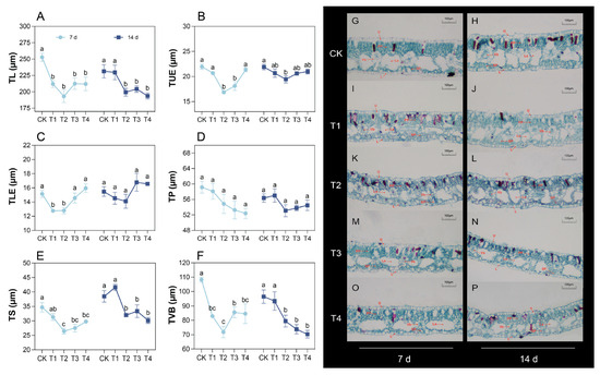 Changes in leaf anatomical structure of P. cordata after 7 d and 14 d exposure to 0 mM (CK), 0.1 mM (T1), 0.2 mM (T2), 0.3 mM (T3), and 0.4 mM (T4) Cd2+. (A–F) Quantitative changes in leaf anatomical parameters, including TL (total leaf thickness), TUE (upper epidermis thickness), TLE (lower epidermis thickness), TP (palisade tissue thickness), TS (spongy tissue thickness), and TVB (vascular bundle thickness). (G–P) Transverse sections of P. cordata leaves showing structural features. Anatomical labels: U (upper epidermis), L (lower epidermis), PP (palisade tissue), SP (spongy tissue), Vb (vascular bundle), and La (lumen). Data represent mean ± SE (n = 3). Different lowercase letters per day indicate significant differences among treatments (one-way ANOVA, Tukey’s test, p ≤ 0.05).