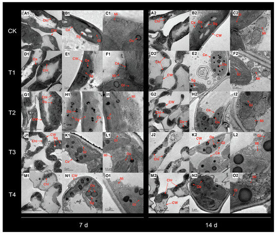 Fourteen days after treatment, the chloroplast ultrastructure of the CK and T1 exhibited no significant changes compared to that on the seventh day (Figure 2). In T2, mesophyll cells began to wrinkle, with a small portion of the chloroplasts separating from the cell wall. Osmiophilic granules increased in size and number, whereas starch grains decreased significantly. In T3, the double membrane started to dissolve, osmiophilic granules were further enlarged, grana lamellae expanded with small vacuoles, and mitochondria continued to shrink. In T4, mesophyll cells exhibited a disordered shape with pronounced wrinkling. Most chloroplasts were clearly separated from the cell wall, the double membrane was further dissolved, osmiophilic granules increased significantly in size and number, starch grains were no longer observable, the grana lamellae expanded with vacuoles, and some mitochondria became elliptical without complete disintegration.