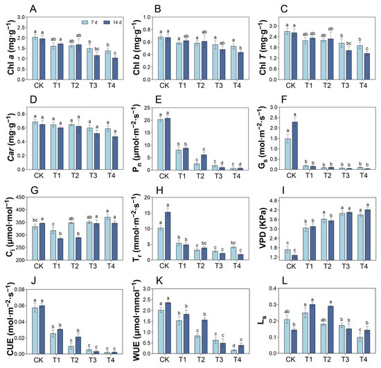 Compared with the CK, the Pn in the leaves of P. cordata decreased by 60.22–96.41% and 57.50–96.02% after 7 and 14 d of treatment, respectively (Figure 3E). In addition, the trend of leaf CUE was consistent with that of Pn (Figure 3J). Compared with CK, leaf Ci significantly increased by 11.30% in T4 7 d after treatment, whereas it decreased by 17.50% and 16.44% in T1 and T2 at 14 d, respectively (Figure 3G). The Gs, Tr, and WUE were significantly inhibited after 7 and 14 d (Figure 3F,H,K). However, the VPD significantly increased after 7 and 14 d (Figure 3I). Moreover, only T4 had a significant decrease in leaf Ls at 7 d compared to the CK, whereas the Ls of T1 and T2 increased significantly at 14 d (Figure 3L).