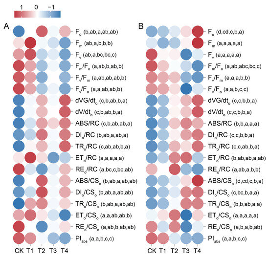 Heatmaps displaying changes in chlorophyll a fluorescence parameter of leaves in P. cordata exposed to 0 mM (CK), 0.1 mM (T1), 0.2 mM (T2), 0.3 mM (T3), and 0.4 mM (T4) Cd2+ for 7 d (A) and 14 d (B). Color scale indicates normalized values (red: high; blue: low). Different lowercase letters per row indicate significant differences among treatments (one-way ANOVA, Tukey’s test, p ≤ 0.05).