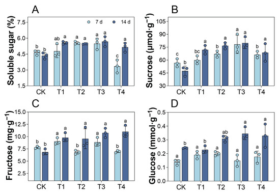 Compared with the CK, the soluble sugar content of the leaves in T1 showed no significant change 7 d after treatment, whereas it significantly increased in T2 and T3 and significantly decreased in T4 (Figure 5A). At 14 d, the soluble sugar content significantly increased by 18.39–30.57% in T1–T4. Compared with the CK, only T1 showed no significant increase in sucrose content at 7 d (p > 0.05); however, fourteen days of treatment with 0.1–0.4 mM Cd resulted in a significant increase in sucrose content of 44.88–68.41% (Figure 5B). Fourteen days of treatment with these Cd concentrations also led to a significant increase in fructose content in the leaves (Figure 5C). Cd treatment for 7 d had no significant effect on the glucose content (Figure 5D). However, at 14 d, the glucose content in T1 and T2 showed no significant change compared to the CK (p > 0.05), whereas it significantly increased in T3 and T4.