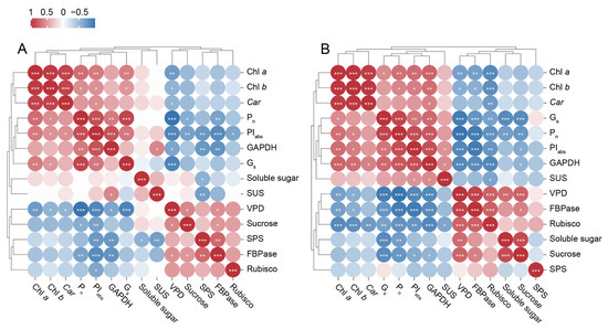 Correlation maps of photosynthetic physiological parameters, soluble sugar, and relevant enzymes for 7 d (A) and 14 d (B). * Correlation was statistically significant at a p-value between 0.01 and 0.05. ** Correlation is statistically significant at a p-value between 0.001 and 0.01, and *** Correlation was statistically significant at the p < 0.001 level for the Pearson correlation coefficient.
