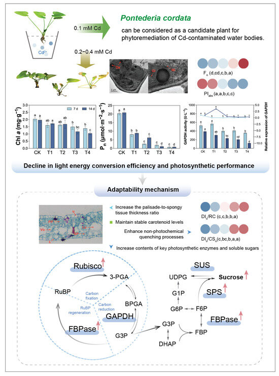 While the photosynthetic responses to Cd stress have been extensively studied in model plants and crops, little is known about aquatic ornamental species. Pontederia cordata, a Cd-tolerant emergent aquatic plant, holds promise for phytoremediation due to its ecological and ornamental value [19]. We hypothesize that P. cordata employs unique structural and physiological adaptations to maintain photosynthetic function under Cd stress, distinct from terrestrial plants. To test this, we investigated the following topics: (1) morpho-anatomical adjustments in leaves and chloroplasts, (2) photosynthetic efficiency through pigment content, gas exchange parameters, and chlorophyll fluorescence, and (3) photosynthetic carbon metabolism regulation via soluble sugar content, sucrose metabolism, and key enzyme expression. This study provides the first comprehensive analysis of Cd-induced photosynthetic adaptations in P. cordata, establishing a theoretical foundation for selecting tolerant plants and advancing phytoremediation strategies for heavy metal-contaminated aquatic systems.