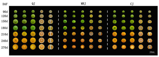The experiment was carried out in the Institute of Fruit Trees, College of Horticulture, Sichuan Agricultural University (30.88°’ N, 104.25°’ E) from June 2023 to October 2024. The fruit samples of QJ, MRJ, and CJ were collected from 8-year-old adult fruit trees on orange rootstocks in the same citrus orchard in Sunjia Village, Xie’an Town, Renshou County, Sichuan Province. The area has a subtropical monsoon humid climate with an altitude of 450–880 m and an average annual temperature of 17.4 °C. The average annual rainfall is 945.9 mm, and the average sunshine duration is 1196.6 h. The orchard employed sprinkler irrigation systems, typically operating from 9:00 PM to 6:00 AM, with the irrigation frequency being adjusted according to the prevailing weather conditions. Sampling began at 90 days after full bloom, and then 36 fruits of 7 developmental stages were selected every 30 days. The peels were stored at −80 °C for the experimental analysis.