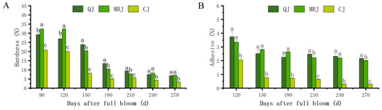 Changes in the peel firmness and peel adhesion of three late-maturing citrus cultivars (QJ, MRJ, and CJ) during different growth stages are shown in Figure 2. A texture analysis demonstrated that both peel firmness and adhesion reached their maximum levels during the early fruit development stage, followed by a progressive decline to their lowest values at full maturity. The most substantial reductions in peel firmness and adhesion occurred during 150–210 and 120–150 d, respectively (peel adhesion measurements commenced at 120 d due to the technical challenge of separating peel from pulp at 90 d). At full maturity, CJ exhibited significantly lower peel firmness compared to both QJ and MRJ, while no significant difference was observed between QJ and MRJ. In terms of peel adhesion, MRJ displayed intermediate values, being significantly lower than QJ but significantly higher than CJ.