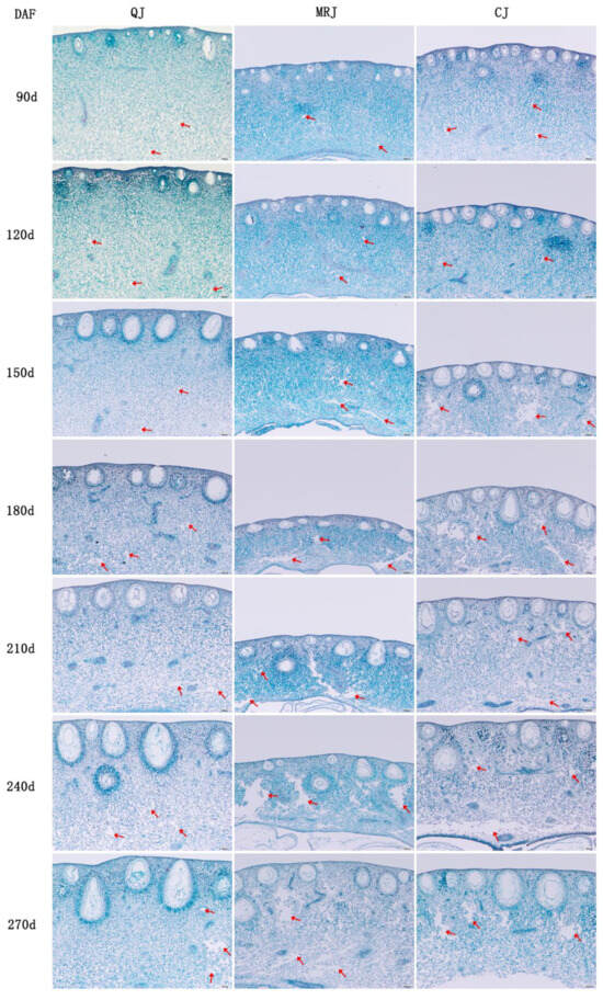 Changes in peel traits of three late-maturing citrus cultivars at different growth and development stages. The area indicated by the red arrow represents the intercellular spaces within the pericarp tissue.