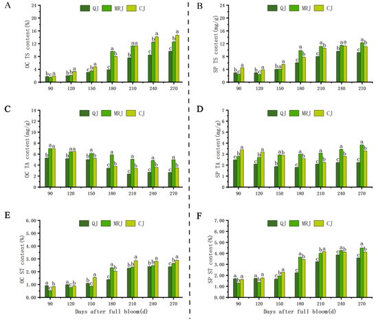 The dynamic changes in intracellular organic components within the peel of three late-maturing citrus cultivars (QJ, MRJ, and CJ) during different developmental stages are presented in Figure 4 and Figure 5. Throughout fruit development, all the cultivars exhibited similar trends in component accumulation: both the oil gland layer and spongy layer showed an initial increase followed by stabilization in their total soluble solids (TS) and soluble tannins (ST) contents. The titratable acidity (TA) content in the oil gland layer initially decreased and then increased, while in the spongy layer it exhibited an overall gradual decline throughout the developmental stages. The critical phase of 150–210 d represented a pivotal metabolic transition period, during which the rapid accumulation of TS and ST occurred concurrently with a sharp reduction in the TA content, specifically within the oil gland layer. At full maturity, sucrose and citric acid emerged as the dominant components of TS and TA pools in both tissue layers across all the cultivars. A comparative analysis revealed that QJ consistently maintained significantly lower (p < 0.05) intracellular accumulation levels of the TS, ST, and TA components relative to both the MRJ and CJ cultivars, suggesting fundamental differences in carbon partitioning and organic acid metabolism during fruit ripening.