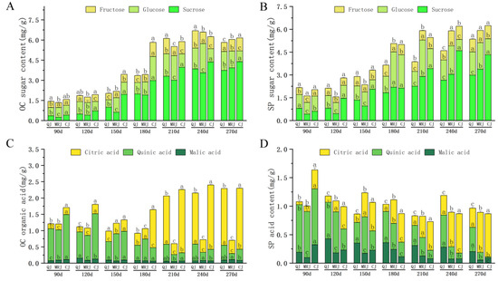 Changes in sugar and acid component content in the peel of three late-maturing citrus cultivars at different growth and development stages. (A) Oil gland layer sugar content. (B) Spongy layer sugar content. (C) Oil gland layer acid content. (D) Spongy layer acid content. Different lowercase letters above the data of different varieties in the same period indicate statistically significant differences as determined by Duncan’s test (p < 0.05).