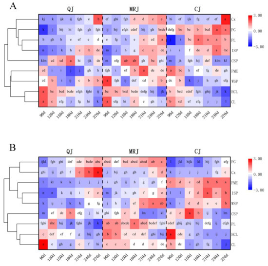 Changes in cell wall polysaccharide content and related degrading enzyme activities in the peel of three late-maturing citrus cultivars at different growth and development stages. (A) Oil gland layer. (B) Spongy layer. The data means were analyzed and visualized using the Heat Map with Dendrogram tool in Origin software. Different lowercase letters indicate statistically significant differences (p < 0.05) according to Duncan’s multiple range test.