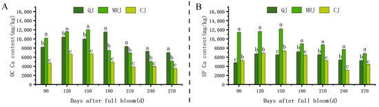 Changes in calcium content in the peel of three late-maturing citrus cultivars during different developmental stages. (A) Oil gland layer. (B) Spongy layer. Different lowercase letters above the data of different varieties in the same period indicate statistically significant differences as determined by Duncan’s test (p < 0.05).