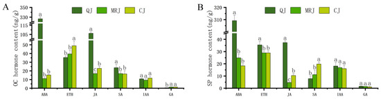 The dynamic changes in phytohormone contents within the peel of QJ, MRJ, and CJ at full maturity are presented in Figure 8. The ABA and ETH concentrations were highest across all the cultivars in both layers, followed by jasmonic acid (JA), salicylic acid (SA), and indole-3-acetic acid (IAA), with GA showing the lowest levels. Specifically, QJ’s oil gland layer contained significantly higher ABA, JA, and SA but lower GA compared to MRJ and CJ (p < 0.05). In the spongy layer, QJ exhibited significantly greater ABA, ETH, and JA contents than the other cultivars (p < 0.05). However, the IAA levels showed no significant differences in either layer among the three late-maturing citrus cultivars (p > 0.05).
