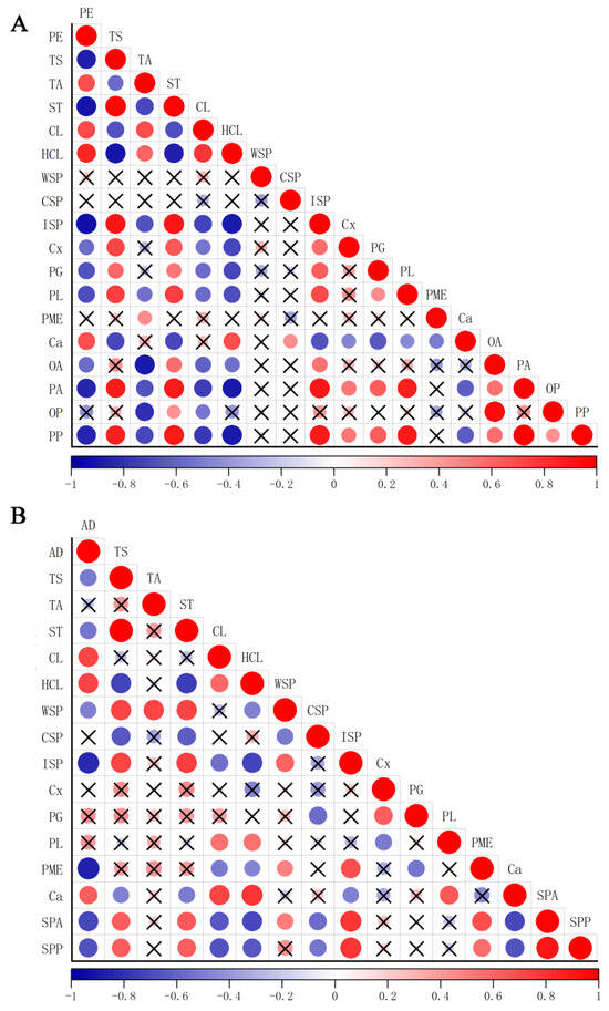 Correlation analysis of peel hardness and peel adhesion force with selected parameters at different growth and development stages. (A) Oil gland layer. (B) Spongy layer. PE: peel hardness; AD: peel adhesion.