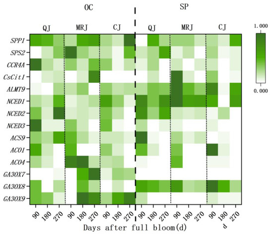 Changes in gene expression levels in the peel of three late-maturing citrus cultivars at different growth and development stages. OC: oil gland layer. SP: spongy layer. The mean values of relative expression data were normalized and analyzed using Origin software.