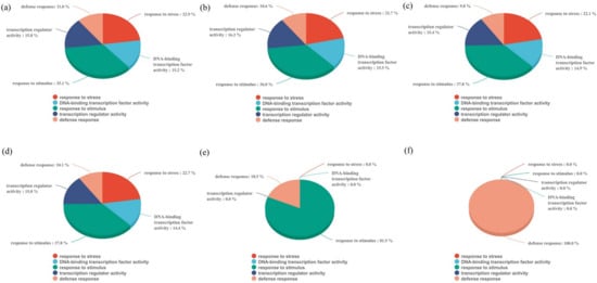 Figure 2. Biological processes (Gene Ontology) of differentially expressed genes (DEGs) from various comparisons. DEGs in the GO enrichment analysis for the comparisons of 0 h vs. 2 h (a), 0 h vs. 4 h (b), 0 h vs. 6 h (c), 0 h vs. 8 h (d), 0 h vs. 12 h (e), and 0 h vs. 24 h (f), respectively.